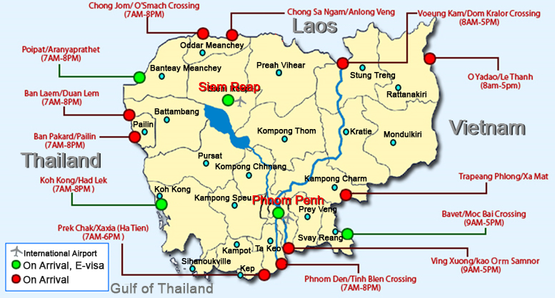 Das kambodschanische Visum wird allen Touristen erteilt, die nach Kambodscha am Eingang der internationalen Flughäfen Phnom Penh – Siem Reap – Sihanoukville und Koh Kong und am Eingang der internationalen Landgrenzen zwischen Thailand und Kambodscha, Vietnam und Kambodscha, Laos und Kambodscha einreisen.